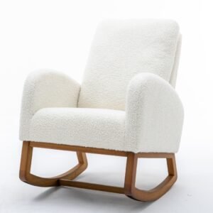 Off White Teddy Fabric Rocking Chair Living Room Chair Bedroom Chair Home Chair with Metal Frame and Solid Wood Legs for Indoor